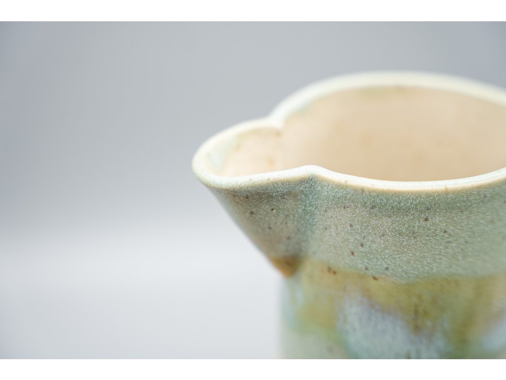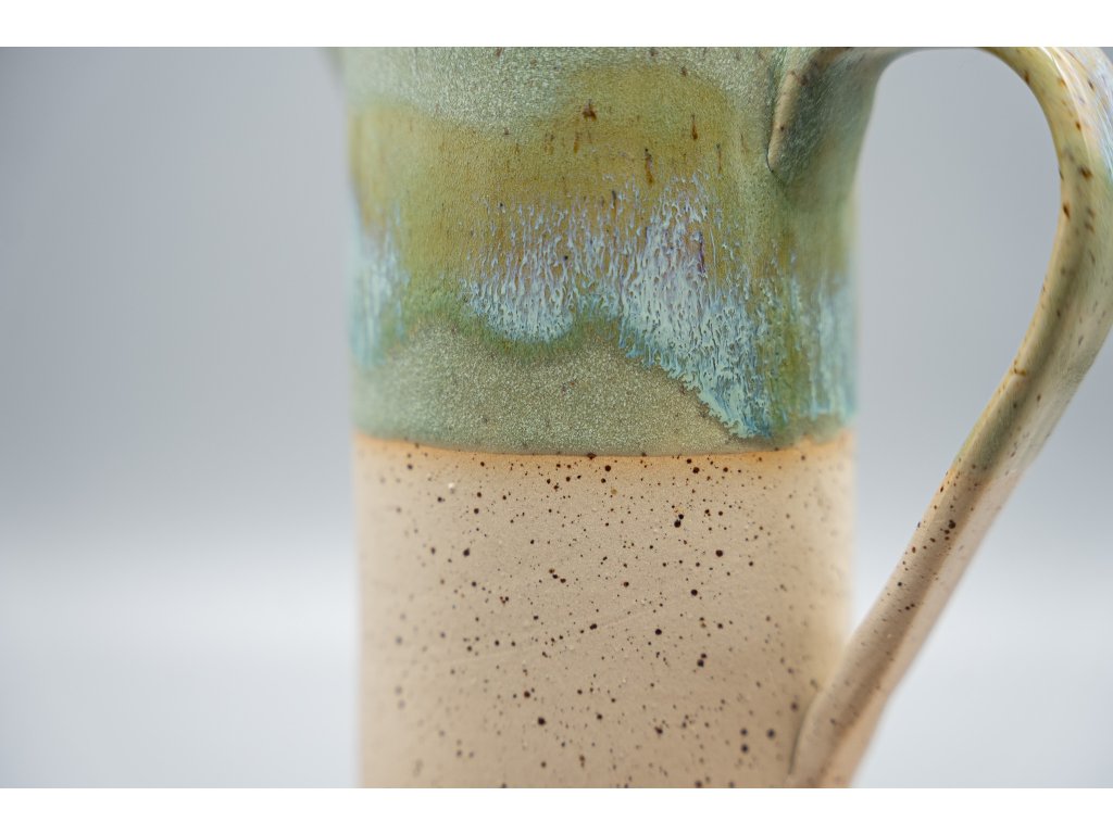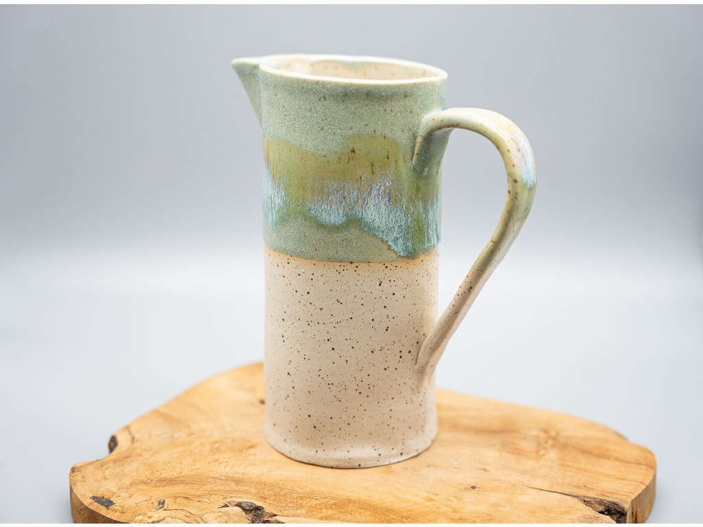 Krásný keramický džbánek, vhodný na nápoje nebo i na květiny. S tímto džbánkem můžete zalévat vaše květiny, nebo ho naopak použít jako vázu a květiny do něj umístit - a to jak živé, tak sušené. Džbánek je vyroben ze světlé tečkované kameniny, glazovaný zelenou efektní glazurou a uvnitř transparentní glazurou. Je odolný díky výpalu nad 1200 °C a má objem 700 ml.