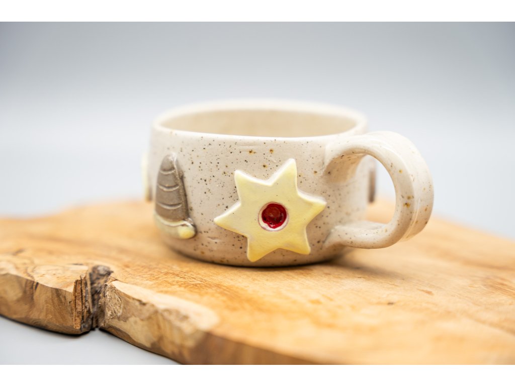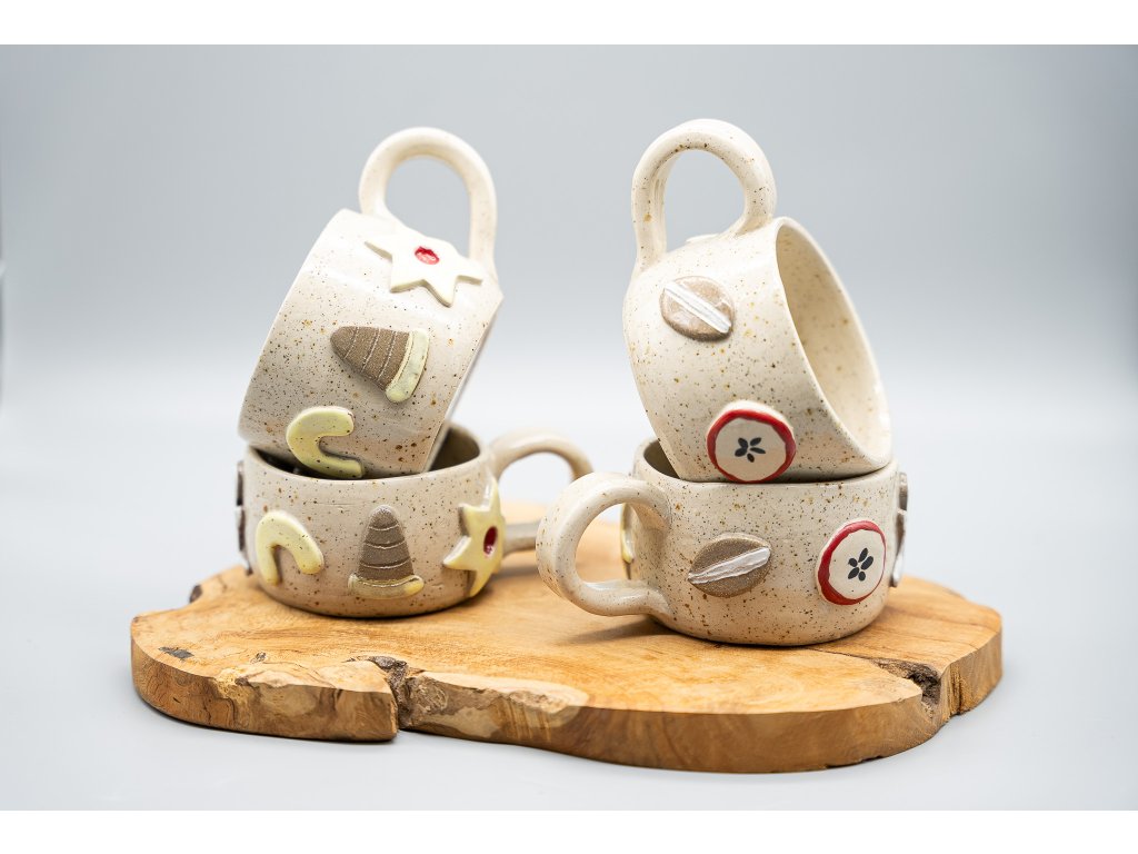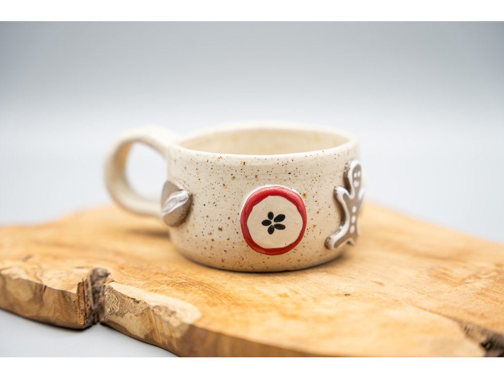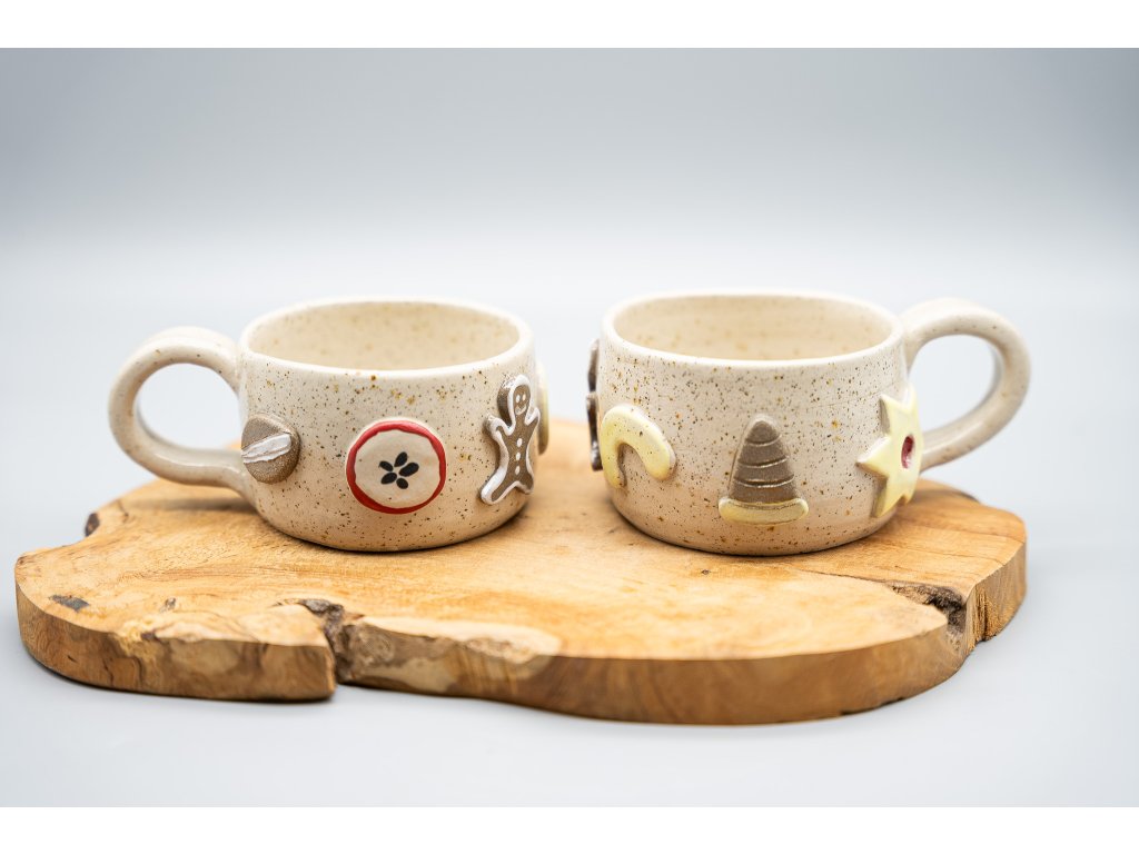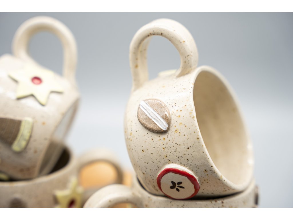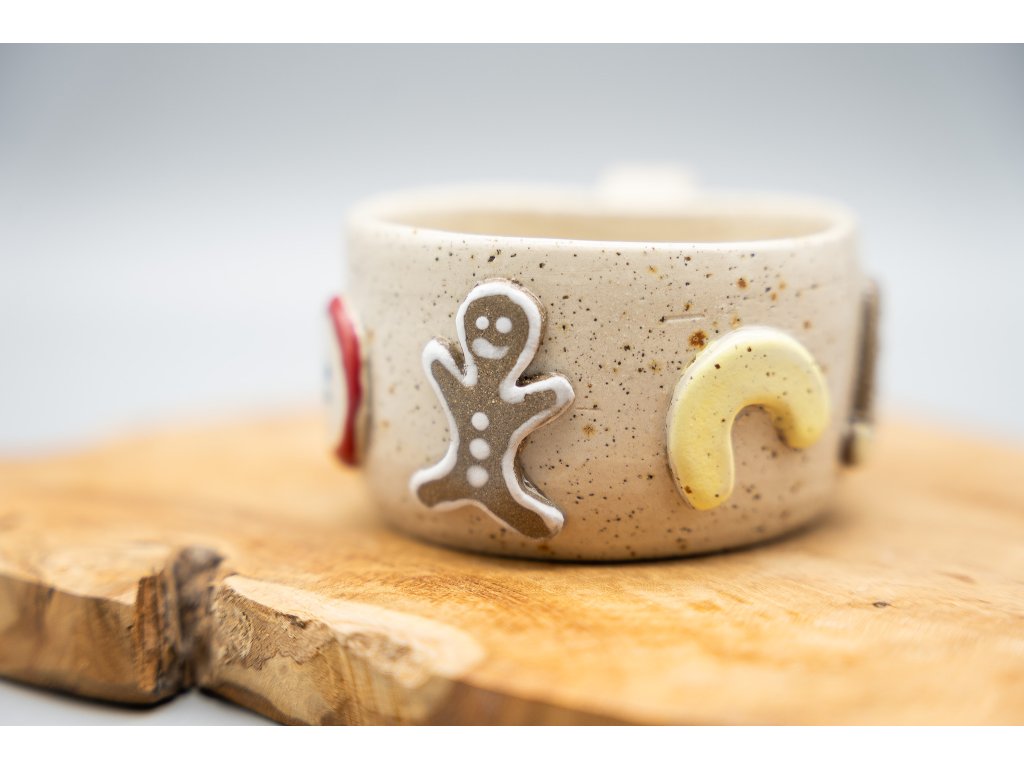 Roztomilé keramické hrnečky s uchem o objemu 200 nebo 250 ml, vyrobené z tečkované kameniny, mají kolem dokola 3D keramické cukroví. Na každém hrnečku najdete linecké, vosí hnízdo, vanilkový rohlíček, perníček, sušené jablíčko a plněný ořech. Hrneček lze mýt v myčce, ale časem může dojít ke zmatnění glazury. Proto je bezpečnější mýt kalíšek v ruce.