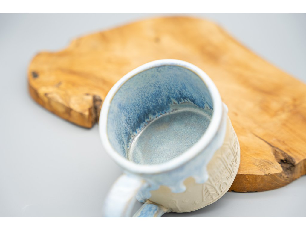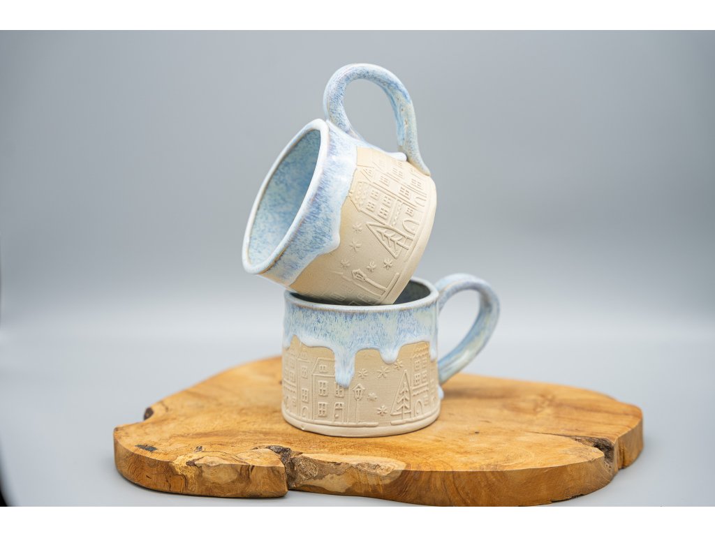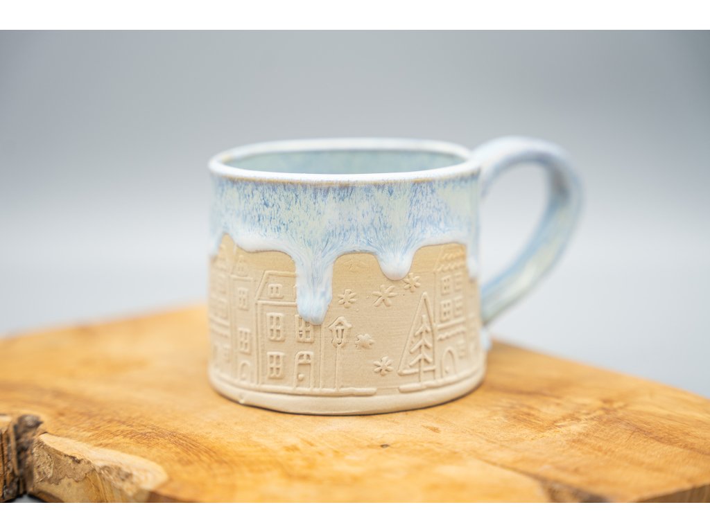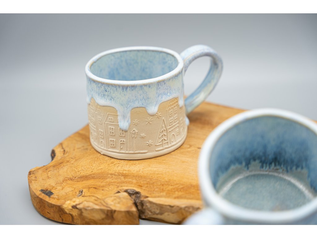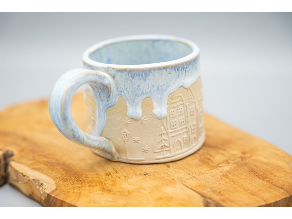 Další hrneček z limitované edice této zimy. Keramický hrnek s objemem 270 ml je ideální na čaj, cappucino, flat white nebo na horkou čokoládu či punč. Stékaná efektní světle modrá glazura vypadá jako sníh nad městem. Hrnek lze mýt v myčce, ale časem může dojít ke zmatnění glazury. Proto je bezpečnější mýt hrnek v ruce.