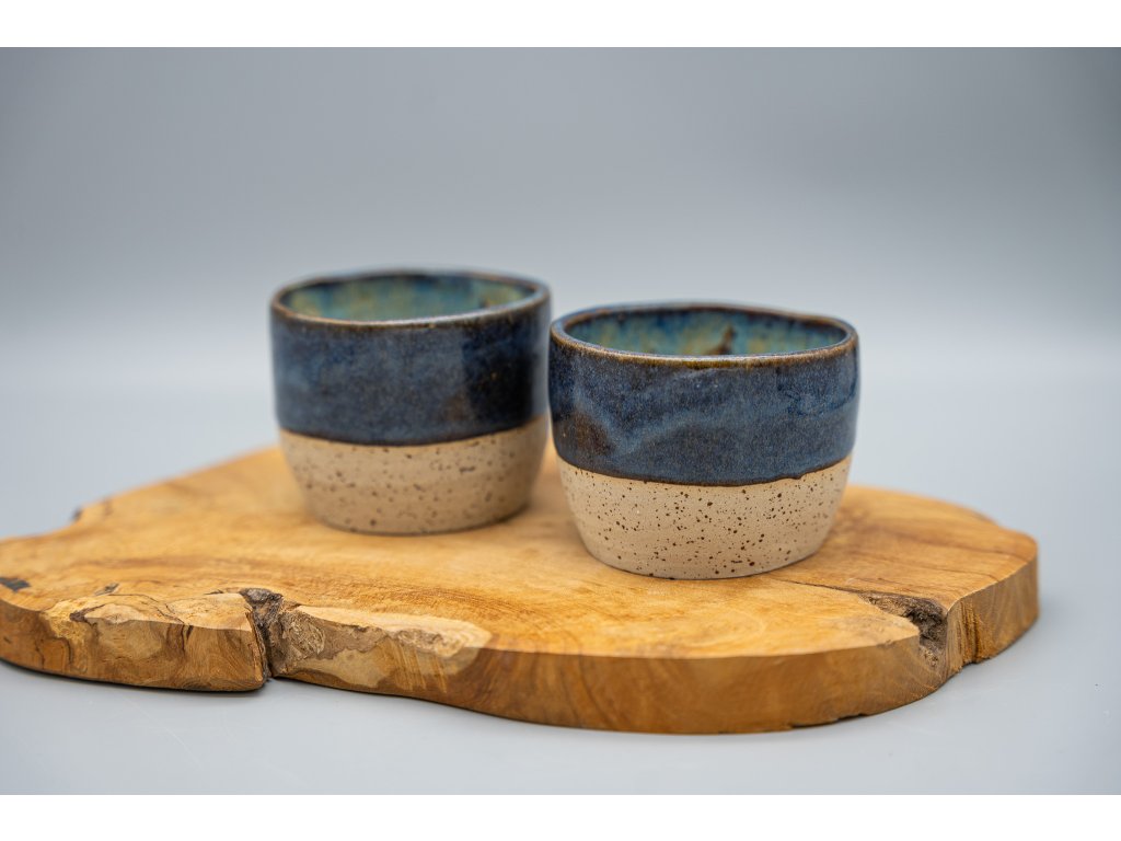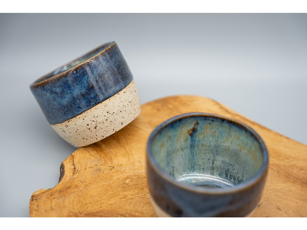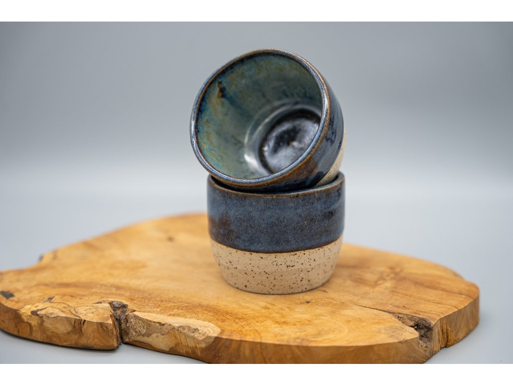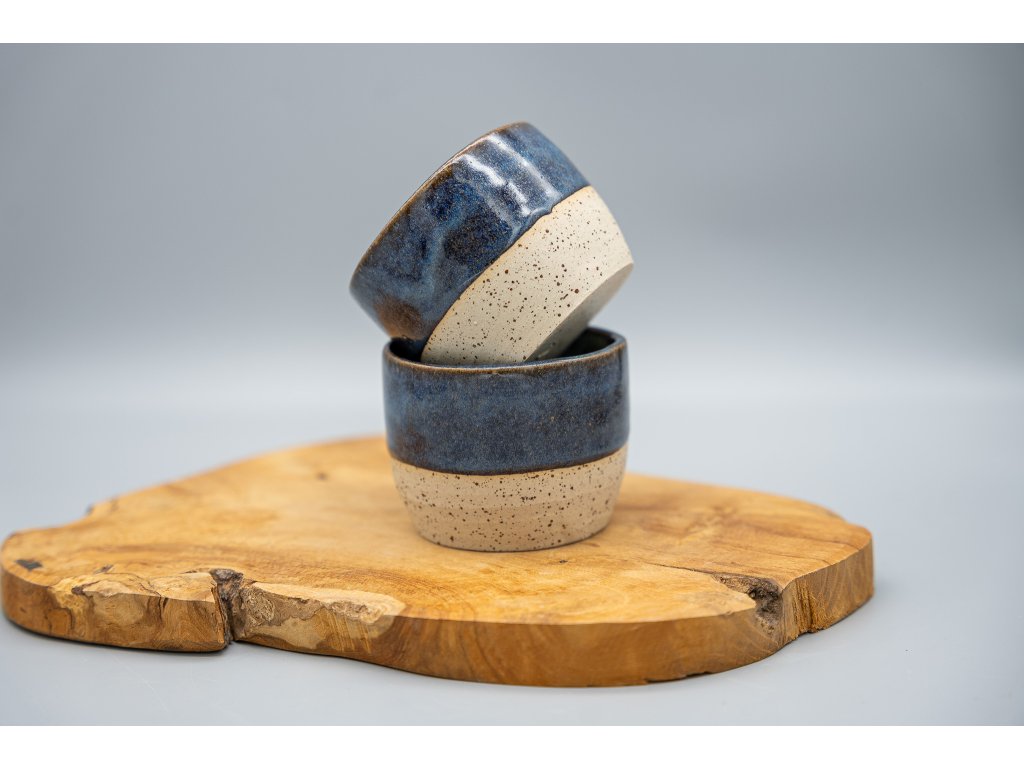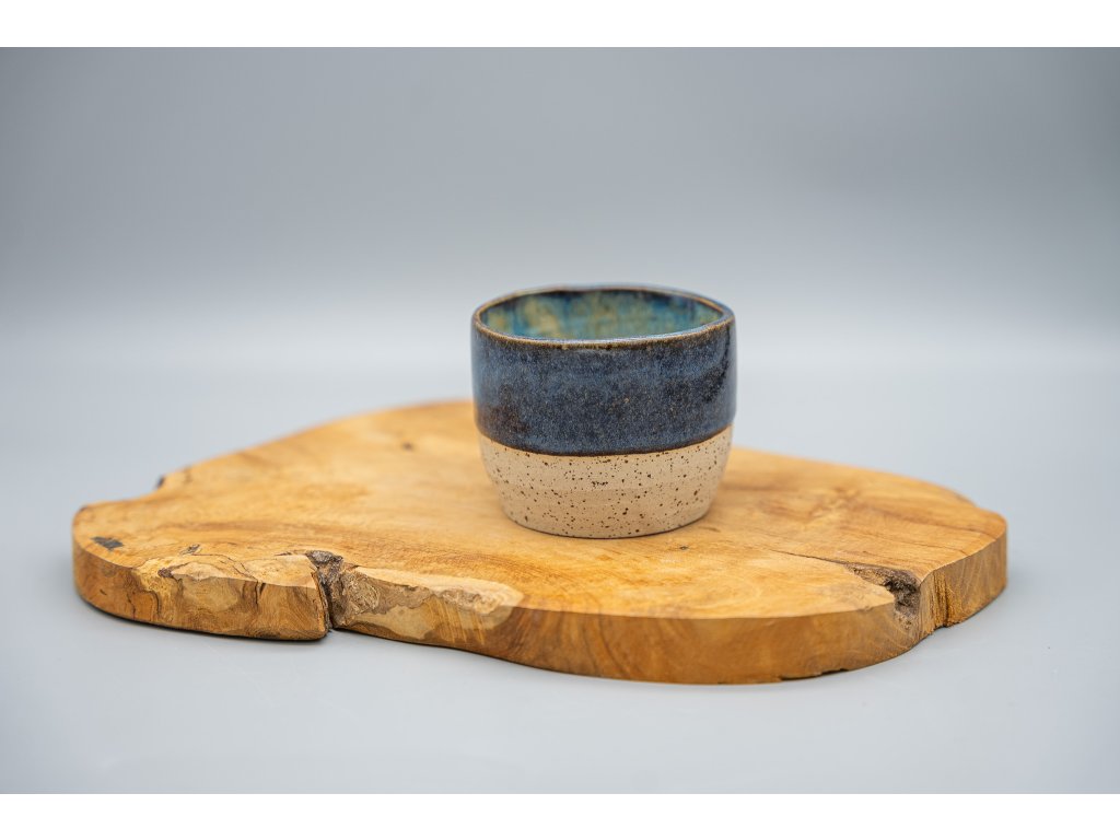 Kalíšek na kávu nebo čaj ze světlé tečkované kameniny o objemu 200 ml s velmi zajímavou tmavě modrou glazurou. Kalíšek lze mýt v myčce, ale časem může dojít ke zmatnění glazury. Proto je bezpečnější mýt kalíšek v ruce.