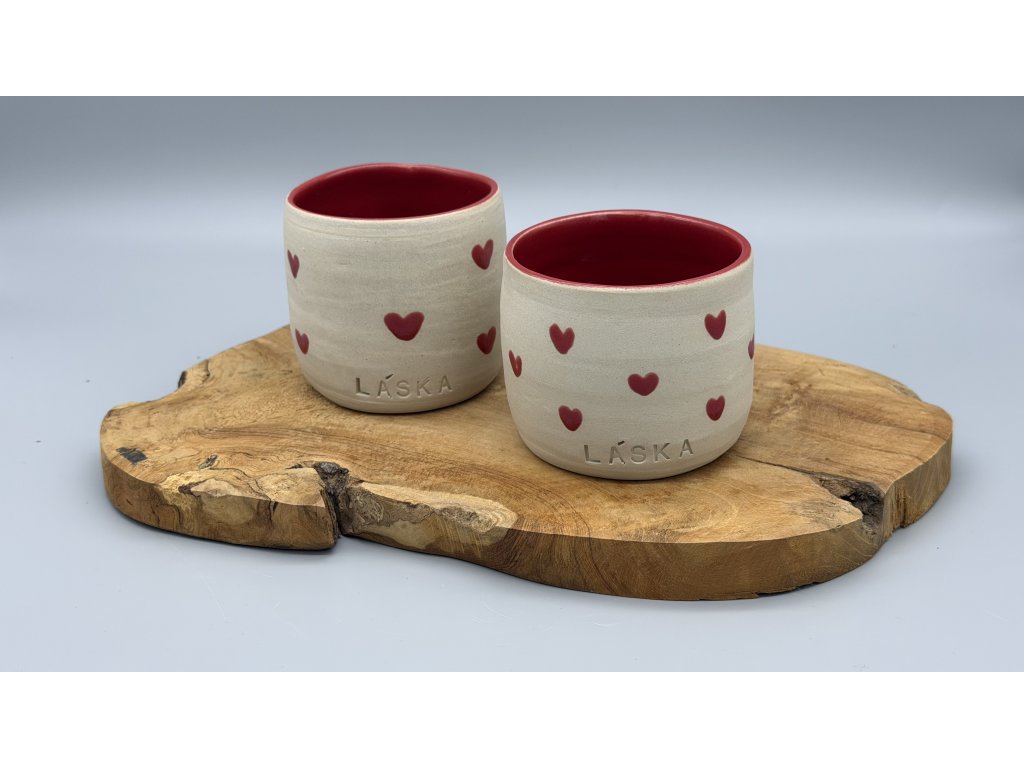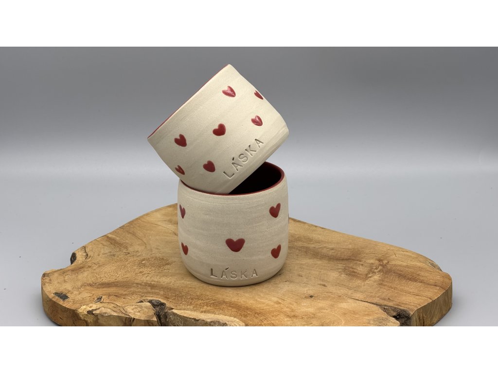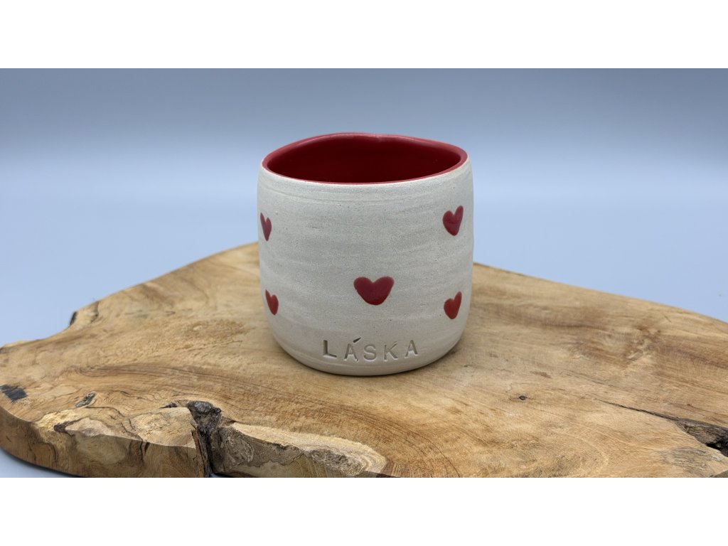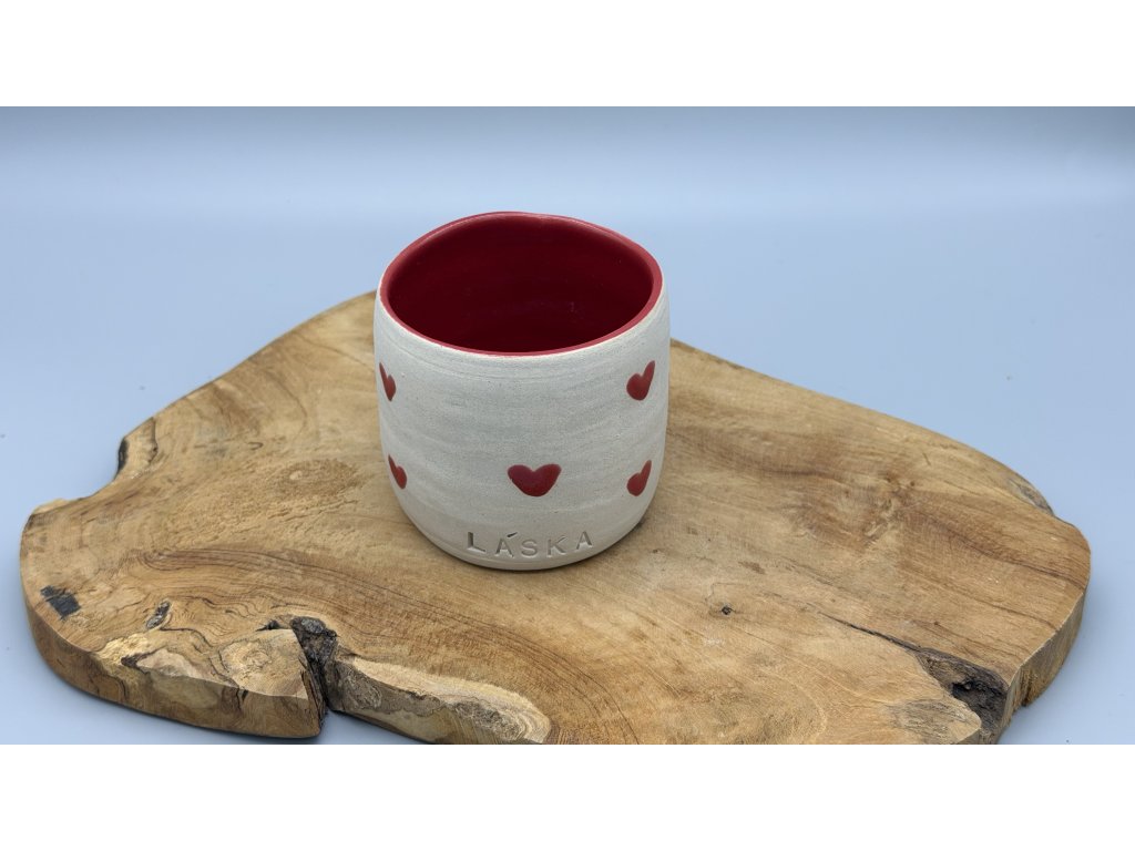 Pokud chcete sobě nebo někomu blízkému udělat radost (nejen na Valentýna), tento keramický kalíšek je tou pravou volbou. Kalíšek o objemu 200 ml ze světlé kameniny je z vnější strany zdobený vyraženým nápisem LÁSKA a červenými srdíčky (jinak bez glazury), a uvnitř glazovaný červenou glazurou.