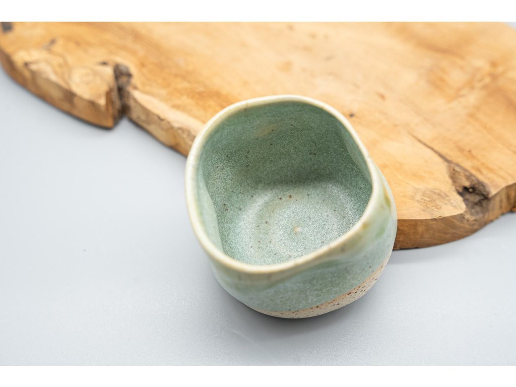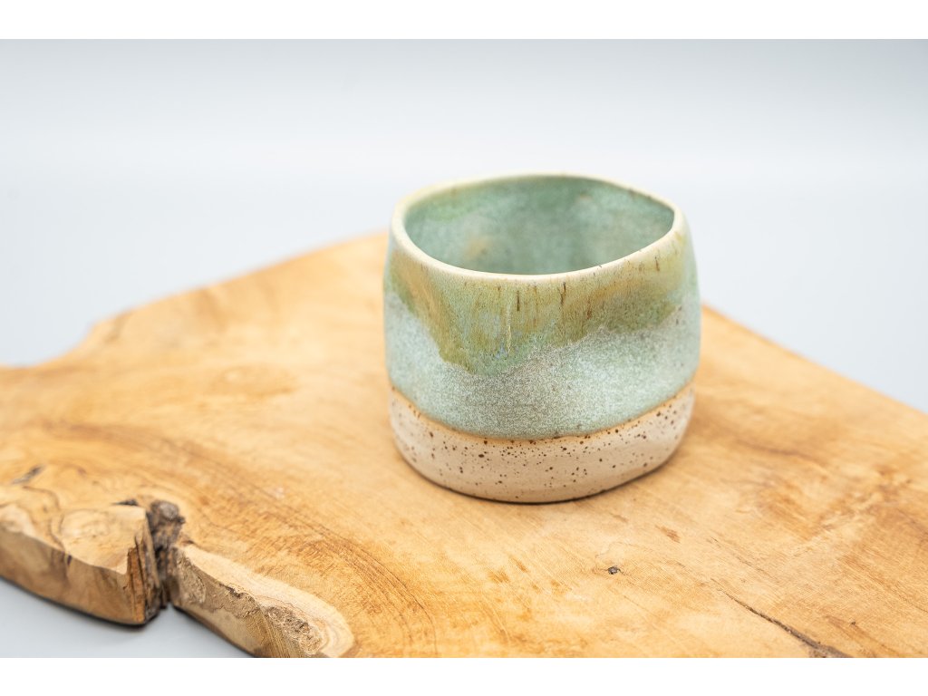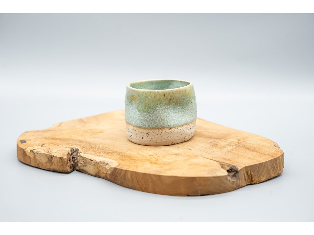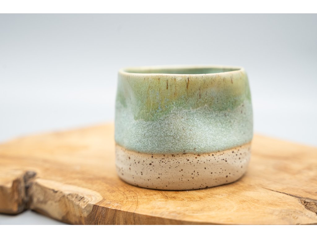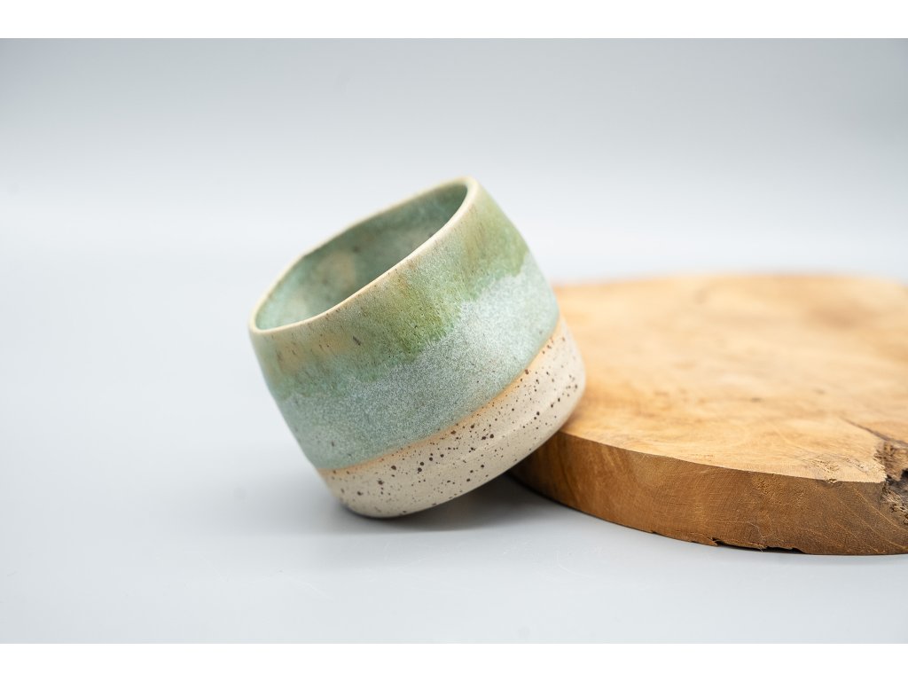 Velmi originální keramický kalíšek o objemu 140 ml vyrobený z tečkované kameniny, glazovaný světle zelenou matnou glazurou. Vymačkané důlky po obvodu dělají z kalíšku unikátní kousek. Kalíšek lze mýt v myčce, ale časem může dojít ke zmatnění glazury. Proto je bezpečnější mýt kalíšek v ruce.