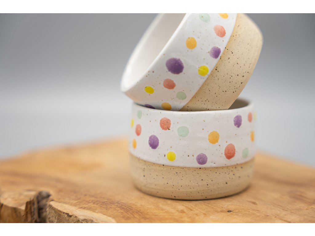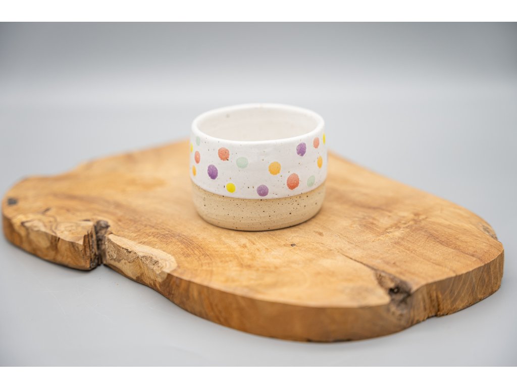 Jarní hit tohoto roku! Kalíšek na kávu z tečkované kameniny o objemu 130 ml s veselou puntíkatou glazurou. Kalíšek lze mýt v myčce, ale časem může dojít ke zmatnění glazury. Proto je bezpečnější mýt kalíšek v ruce.