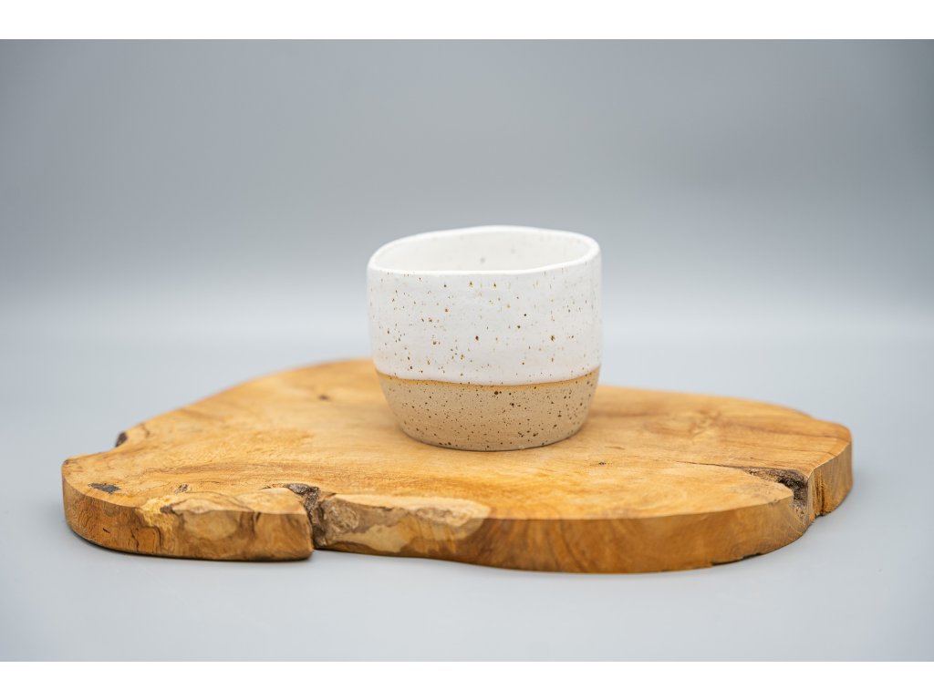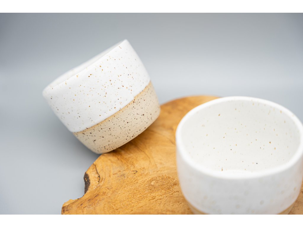 Kalíšek na kávu nebo čaj z tečkované kameniny o objemu 240 ml vás dostane svou jednoduchostí a bílou lesklou glazurou. Kalíšek lze mýt v myčce, ale časem může dojít ke zmatnění glazury. Proto je bezpečnější mýt kalíšek v ruce.