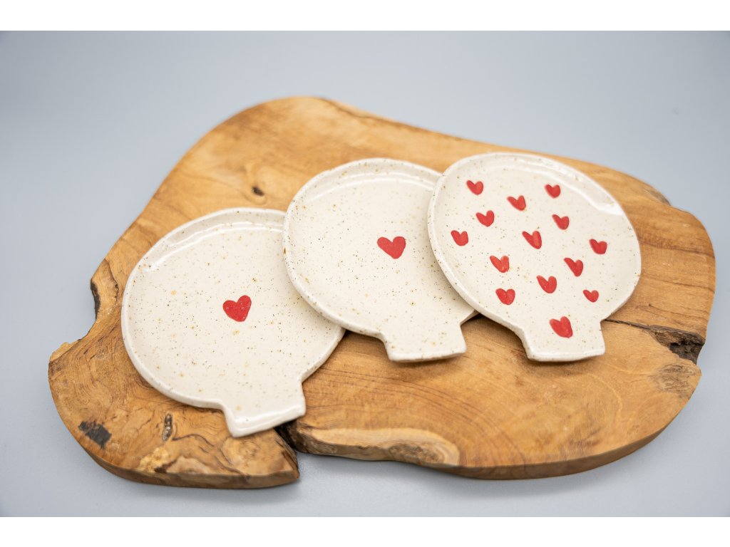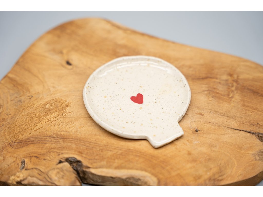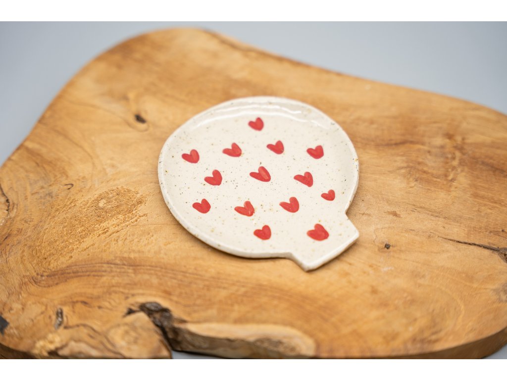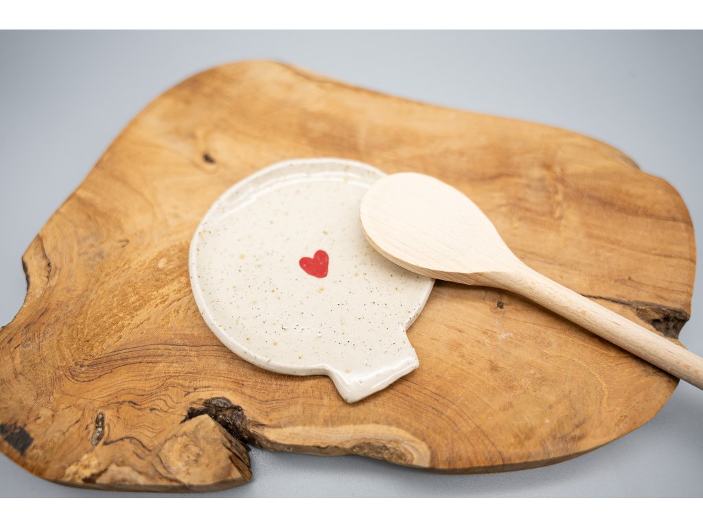 Praktický pomocník do kuchyně, na který si můžete odložit vařečku během vaření. Díky tomu si neušpiníte kuchyňskou linku nebo sporák. Podložka je vyrobena ze světlé tečkované hlíny, zdobená červenými srdíčky a glazovaná průhlednou glazurou. Je vypálena na 1200°C, můžete ji tak směle dát i do myčky na nádobí. Průměr podložky pod vařečku je cca 9 cm.
